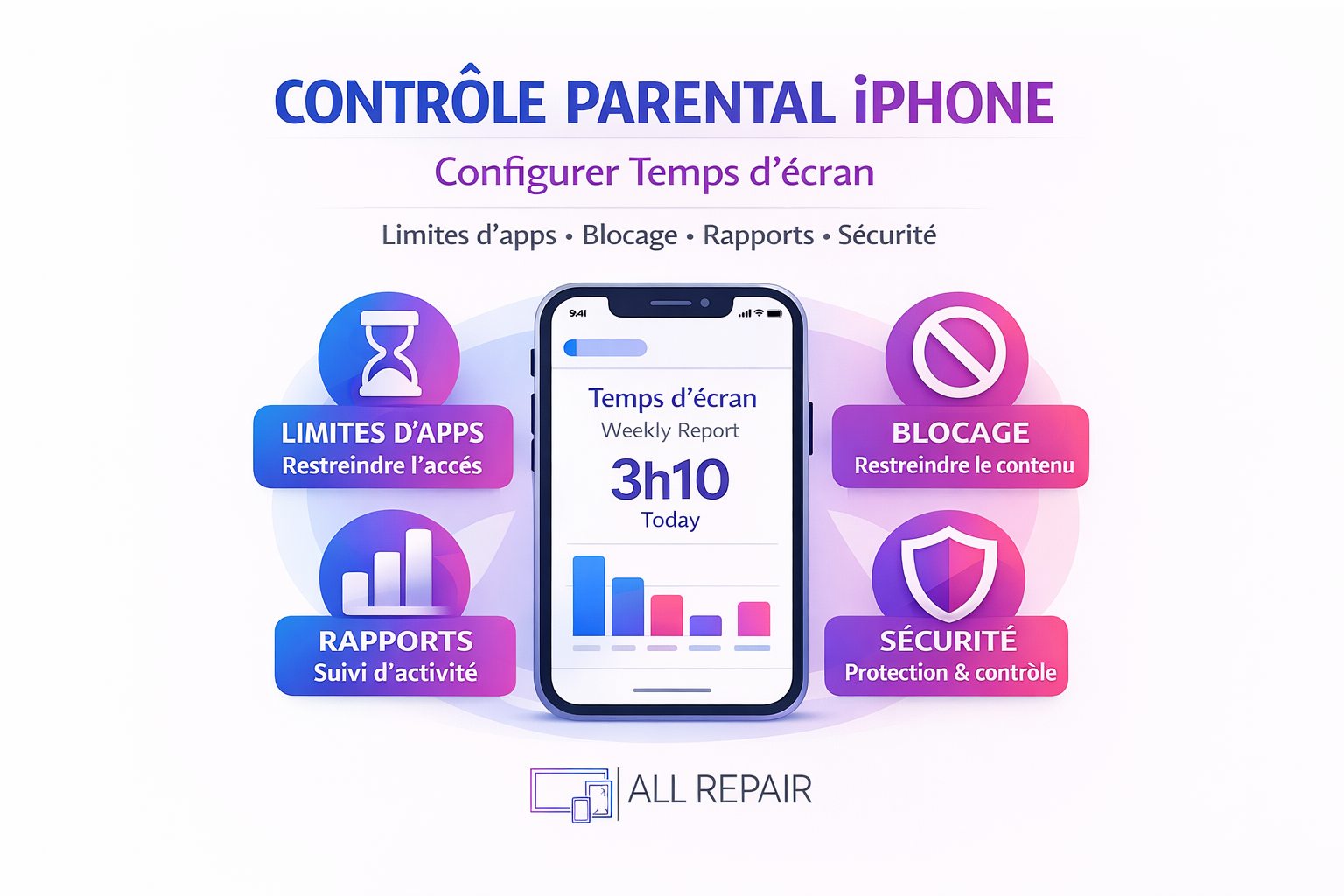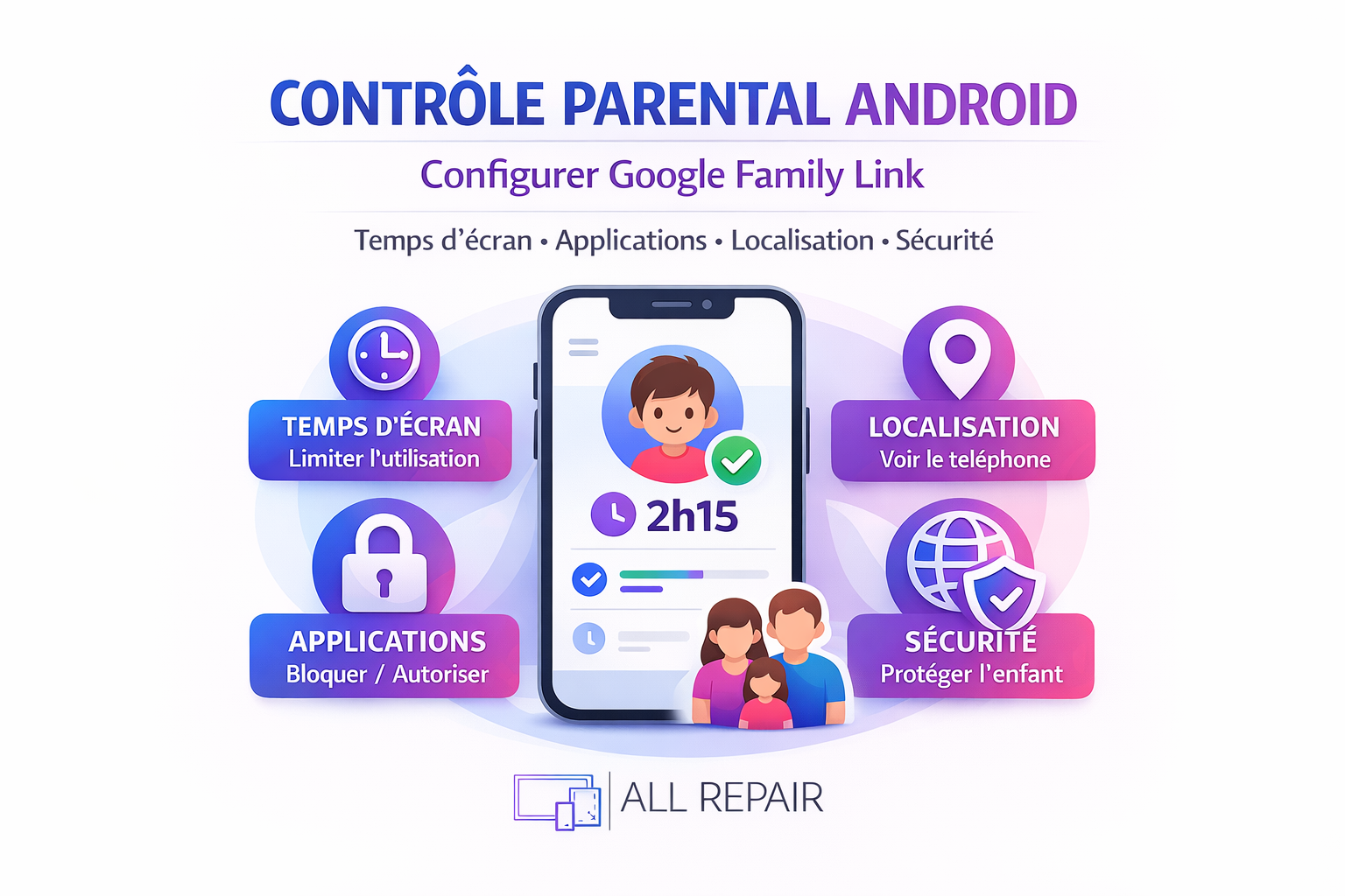 Chez AllRepair à Paris, nous configurons le contrôle parental Android, Google Family Link, la sécurité et les limites d’utilisation pour les smartphones des enfants.