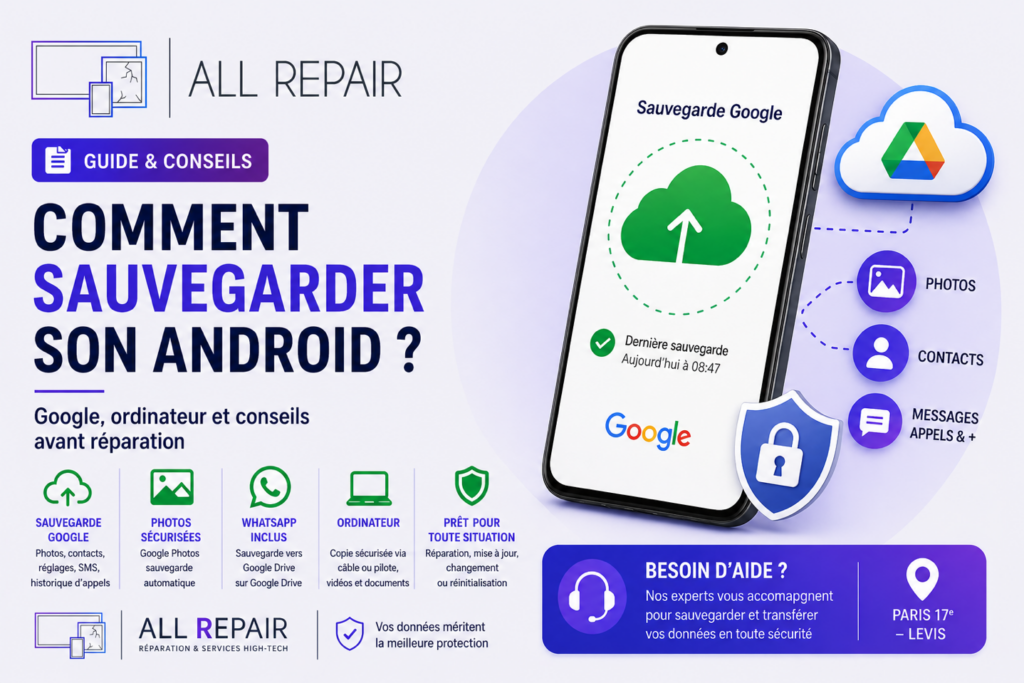 Chez AllRepair à Paris, nous vous aidons à sauvegarder votre Android avant réparation ou transfert.