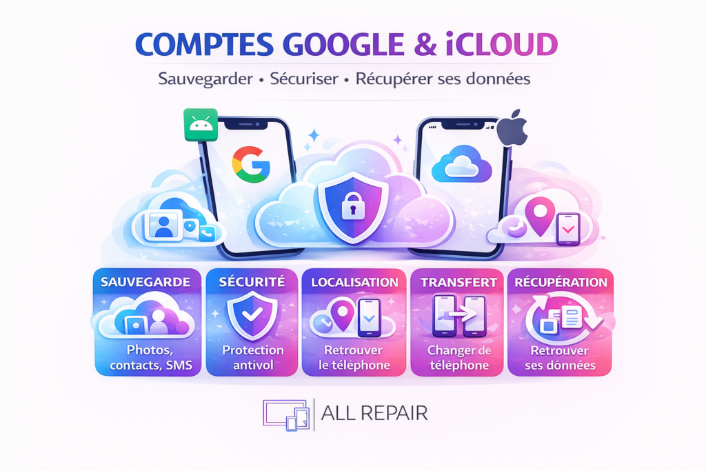 Les comptes Google et iCloud sont indispensables pour sauvegarder, sécuriser et récupérer ses données. Un smartphone sans sauvegarde est un smartphone à risque. En cas de casse, de perte ou de vol, toutes vos données peuvent disparaître si le compte n’est pas correctement configuré. Chez AllRepair, nous vous aidons à configurer, sauvegarder et transférer vos données en toute sécurité.Besoin d’aide ?